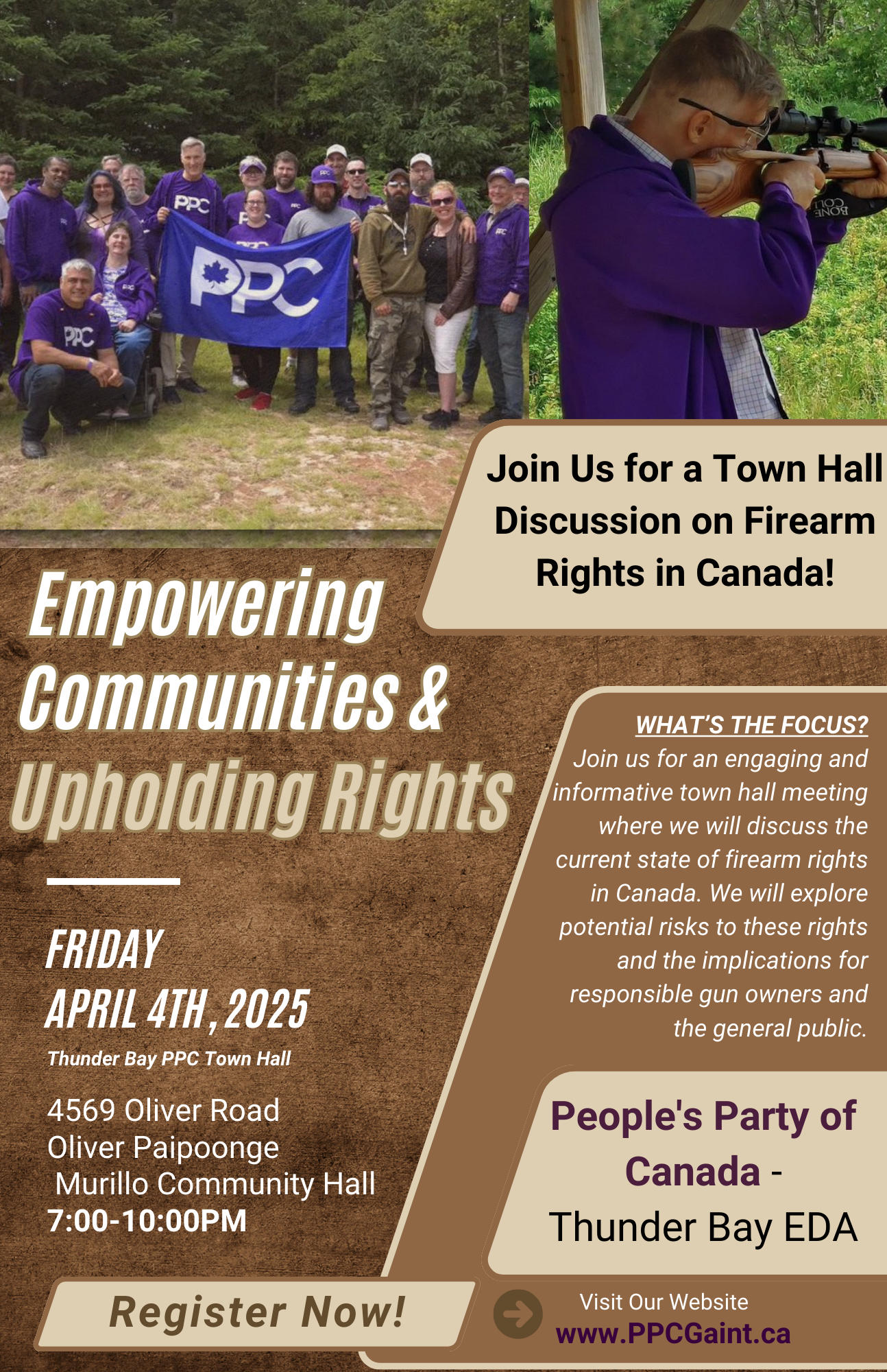 Events April 4, 2025 – Town Hall Meeting People’s Party of Canada Hosts Firearm Rights in Canada! Murillo Community Centre – 4569 Oliver Rd, Thunder Bay, ON Doors open at 7:00. Register for the event Please enable JavaScript in your browser to complete this form.Name *FirstLastEmail *Phone *How did you hear about this event?Friend or colleagueSocial MediaPostcardOtherIf OtherHow many in your group are attending? *123456Choice 7Submit